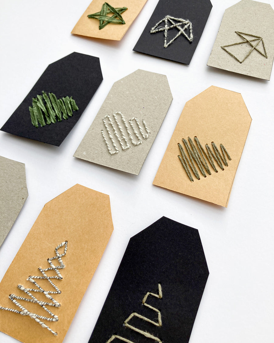 Sy små fine gavemærker med Grafisk Broderi. Alt du skal bruge er syl, nål, saks, tape, pap eller karton og lidt rest-garn samt et udprint af juleskabelonerne, så er I klar til jule-krea-hygge.
