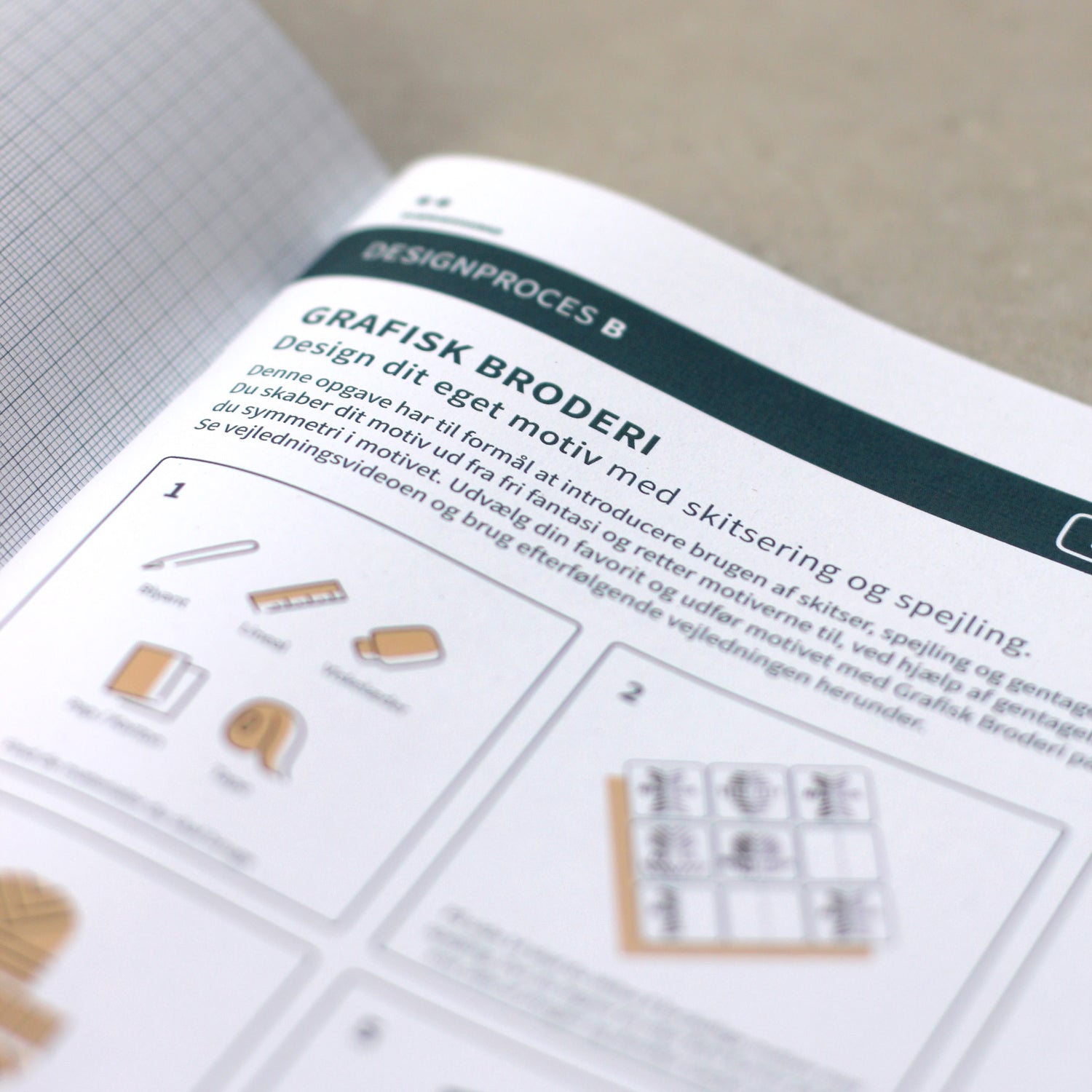 Opgavehæftet indeholder 3 forskellige designprocesser – i forskellige sværhedsgrader – hvor eleverne (alt efter alderstrin) kan vælge en metode eller sværhedsgrad, som fører dem igennem forskellige måder at designe deres eget motiv.